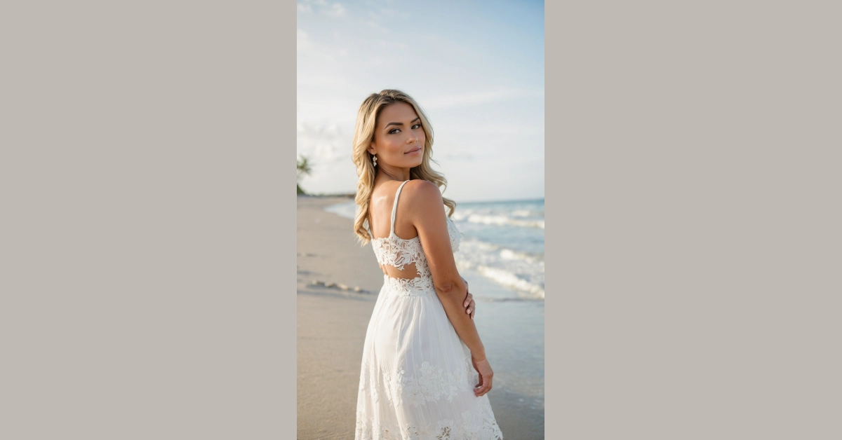Getting ready for a tropical beach photoshoot means balancing beautiful vibes with the reality of sand getting everywhere. This picture totally captures that breezy, perfect moment on the shore, with the ocean waves just doing their thing in the background. But let’s be real, wearing a stunning white dress like that on a sandy beach takes some serious courage – or maybe a secret superpower to repel all the tiny grains that try to attach themselves. We’re pretty sure there was an entire team on standby with lint rollers and a ‘no touching the sand’ policy just for this shot!